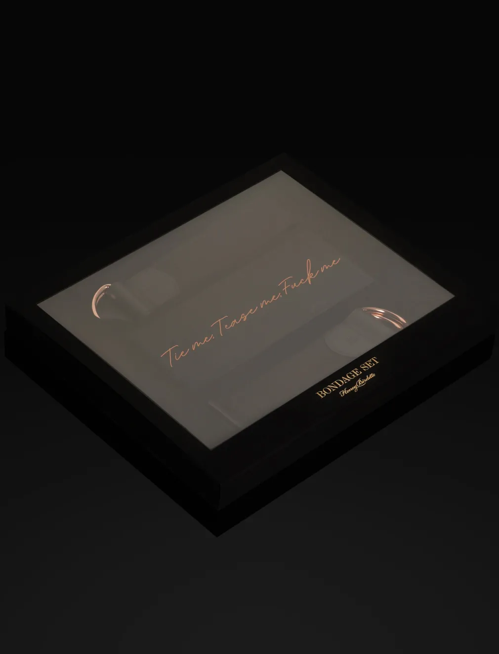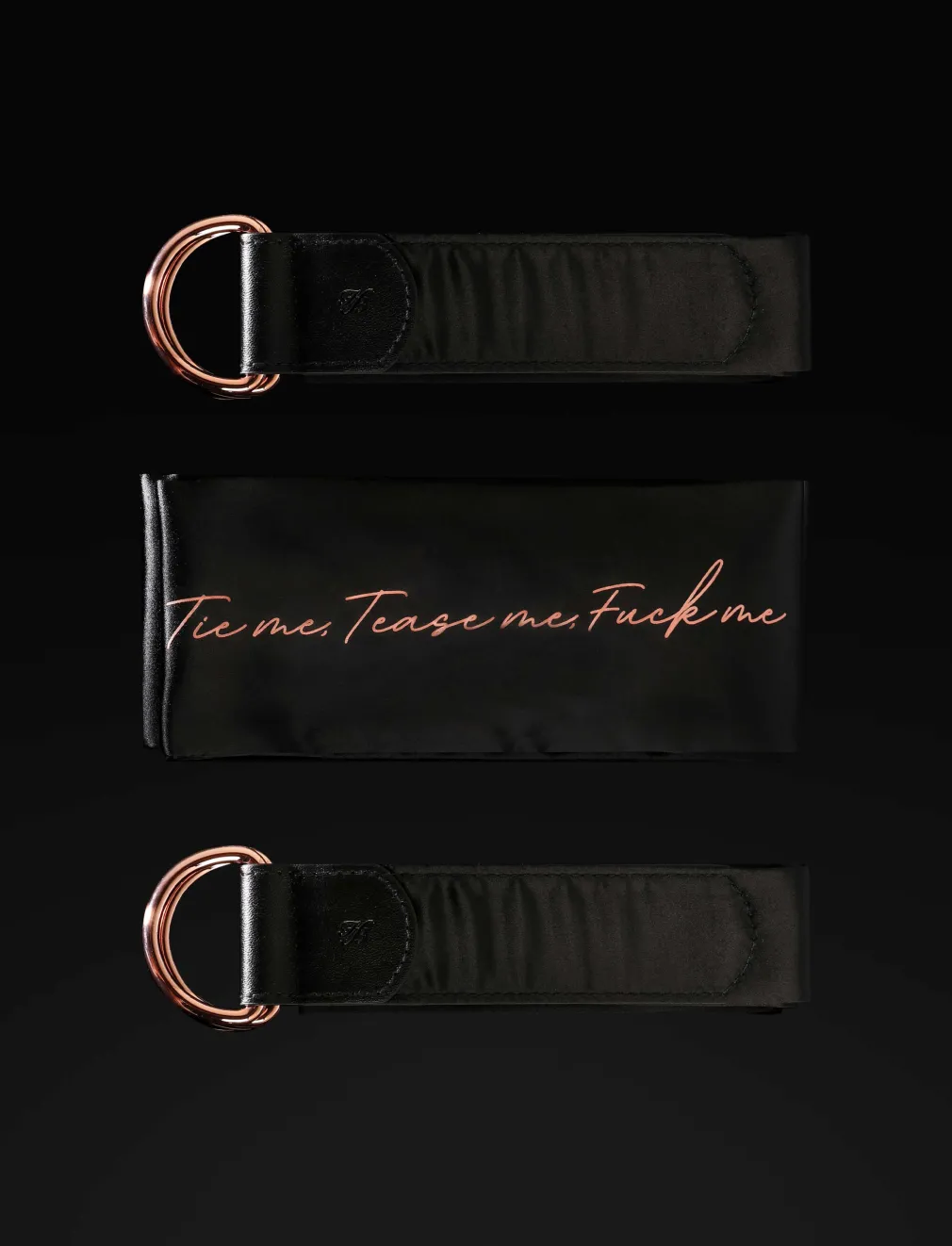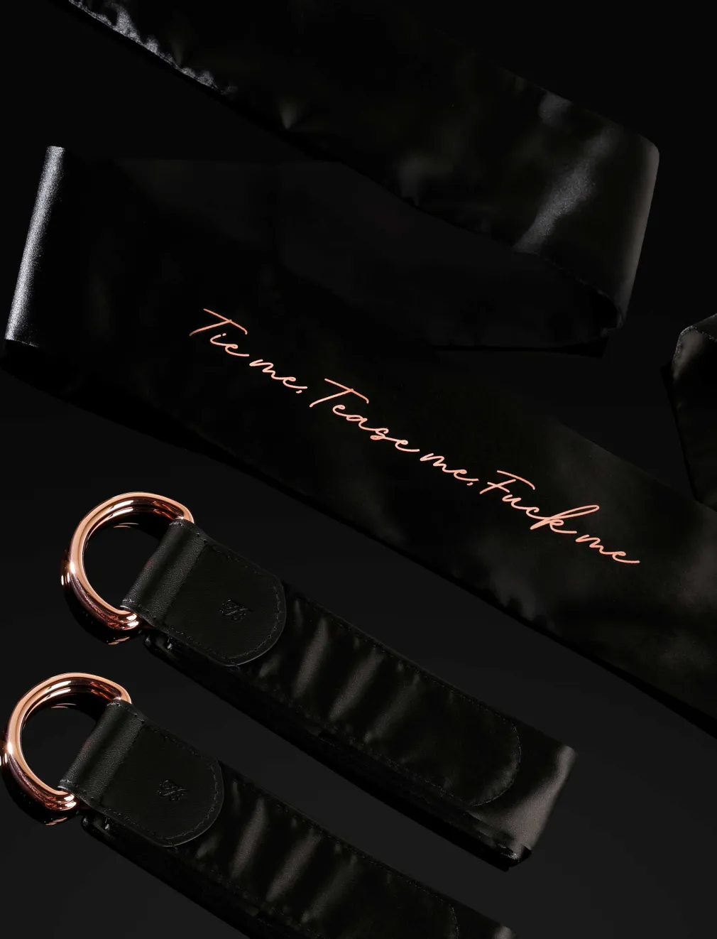 They say actions speak louder than words, so let your ties do the talking. Enhance intimacy and test your techniques with this Deluxe Bondage Kit. Perfect for bedroom bondage or a handy essential for any connoisseur, this limited edition set comes with a blackout blindfold and a pair of satin ties that are inscribed with your lover’s every wish…
