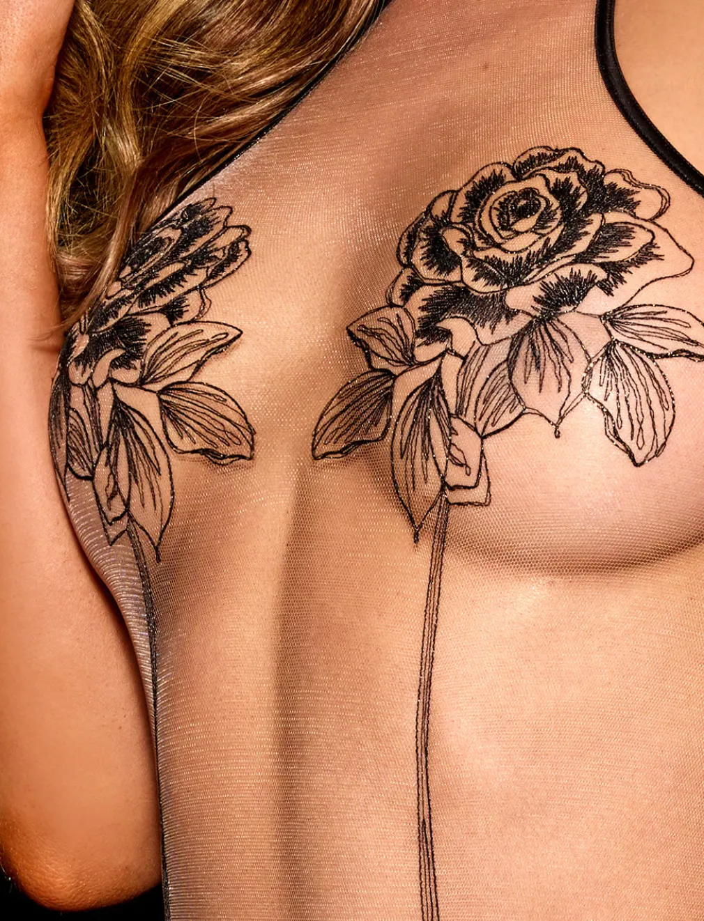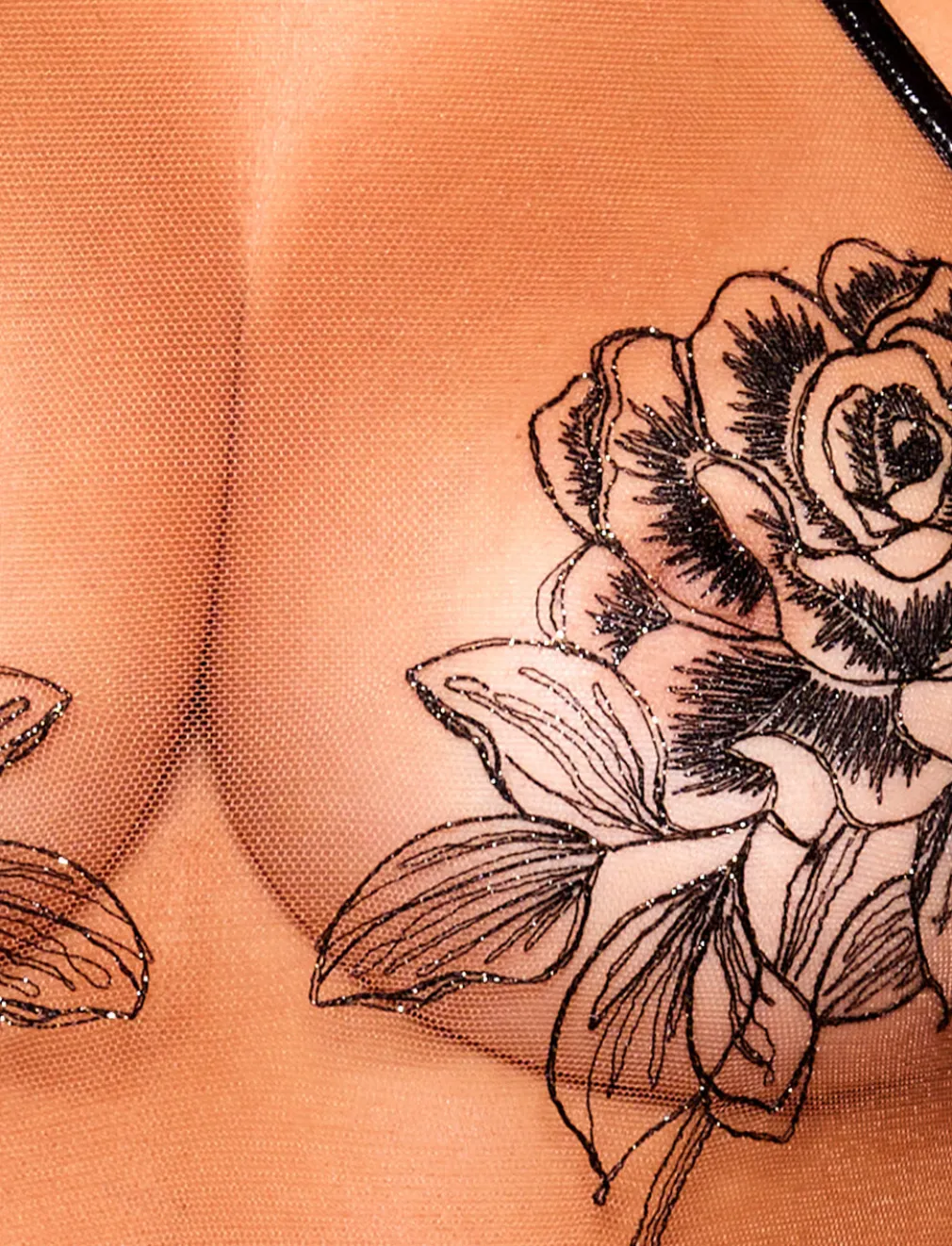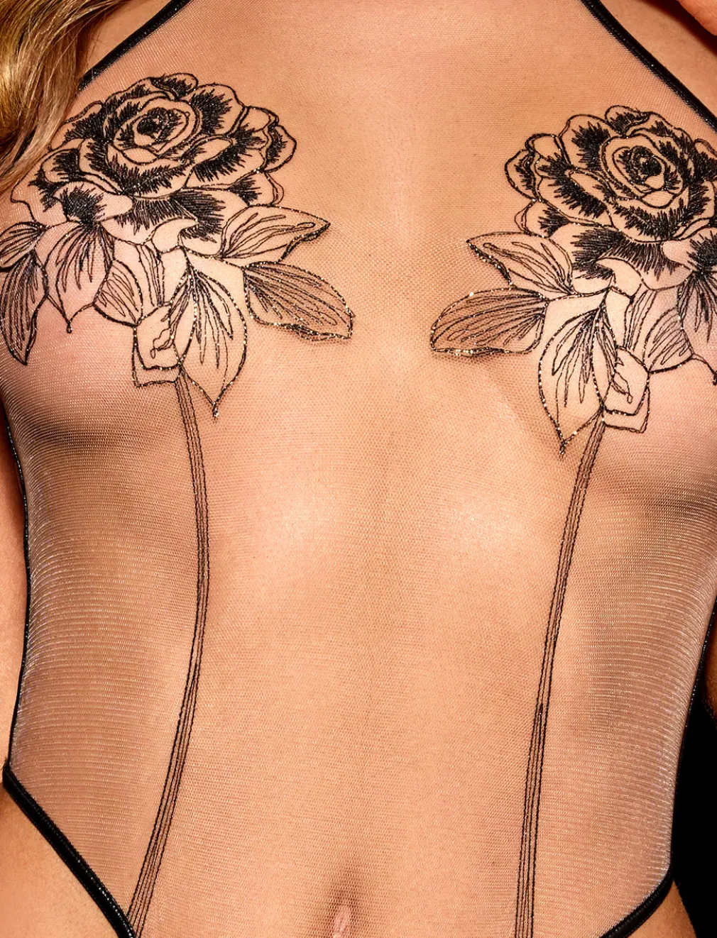 You begged. We listened. Our sellout Rosa bodysuit is back in stock! With a minimalist approach and maximum sex appeal, this ultra-sexy bodysuit features foiled satin binds, fitted illusion tulle, and black rose embroidery of exceptional Swiss design. Want to make a statement? Turn to the back to see a glimpse of gold chain topped with a custom rose charm that gently sways.