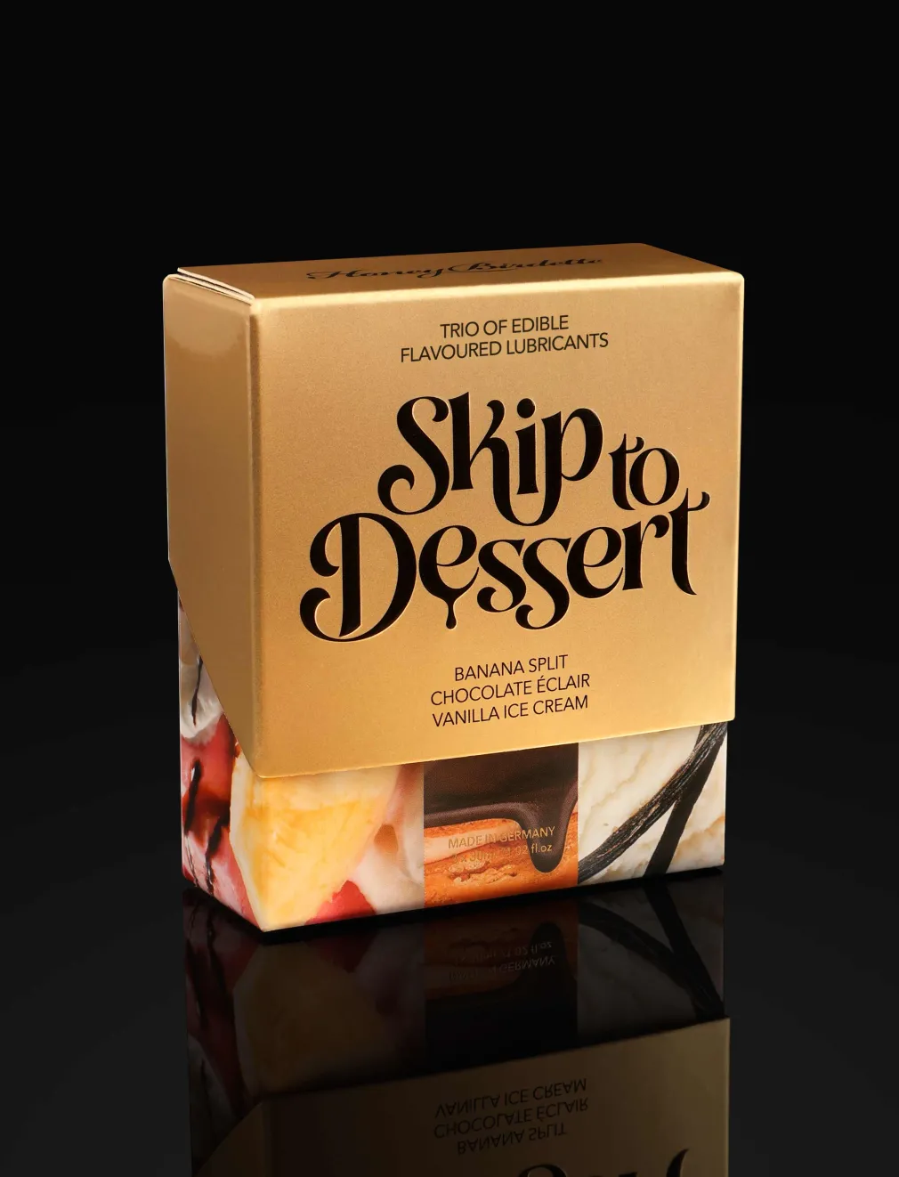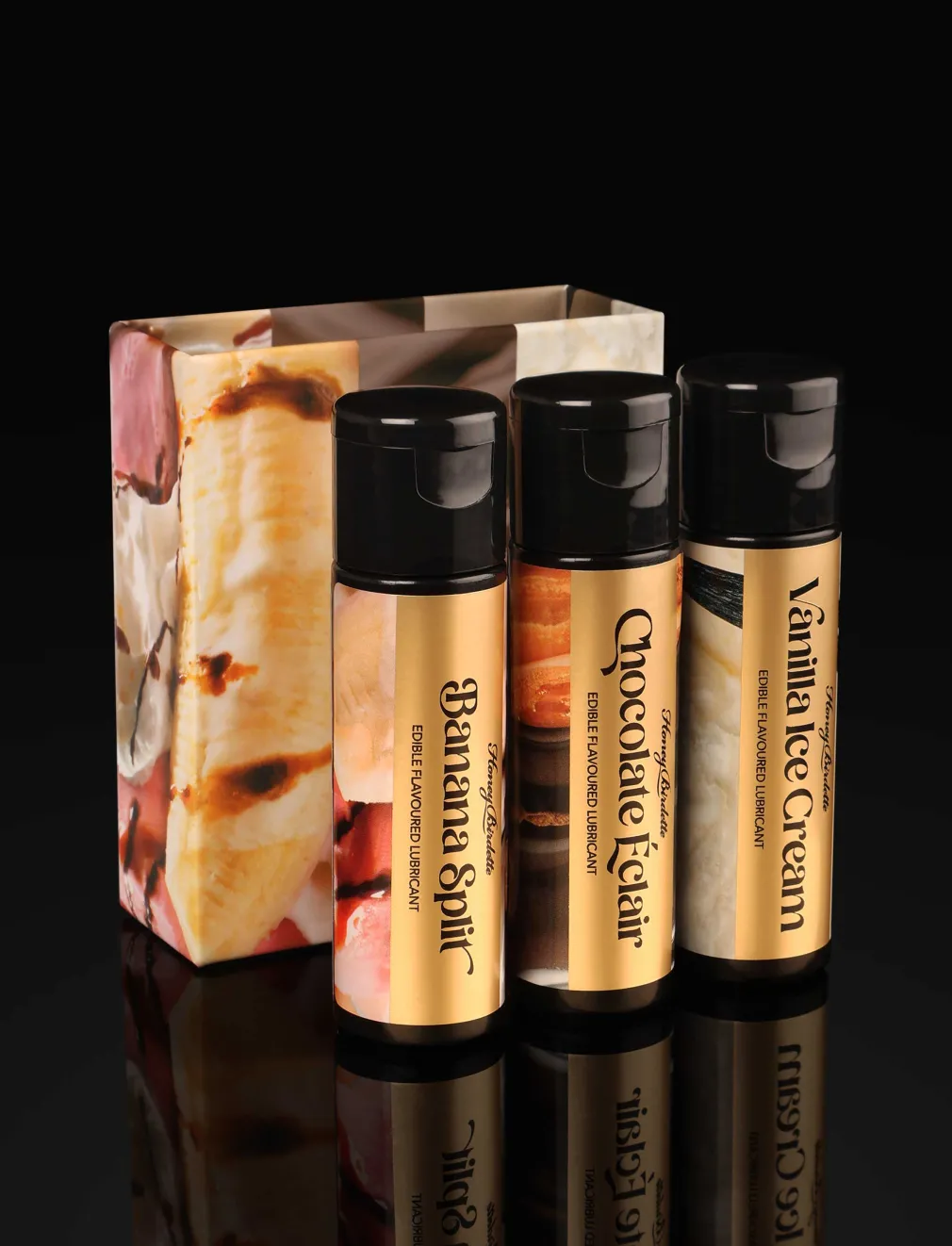 Date night coming up? Skip the three-course meal and go straight to dessert. Upgrade your oral play with a sweet selection of Banana Split, Chocolate Éclair and Vanilla Ice Cream. Pour it on and lick it up! Dessert is served.